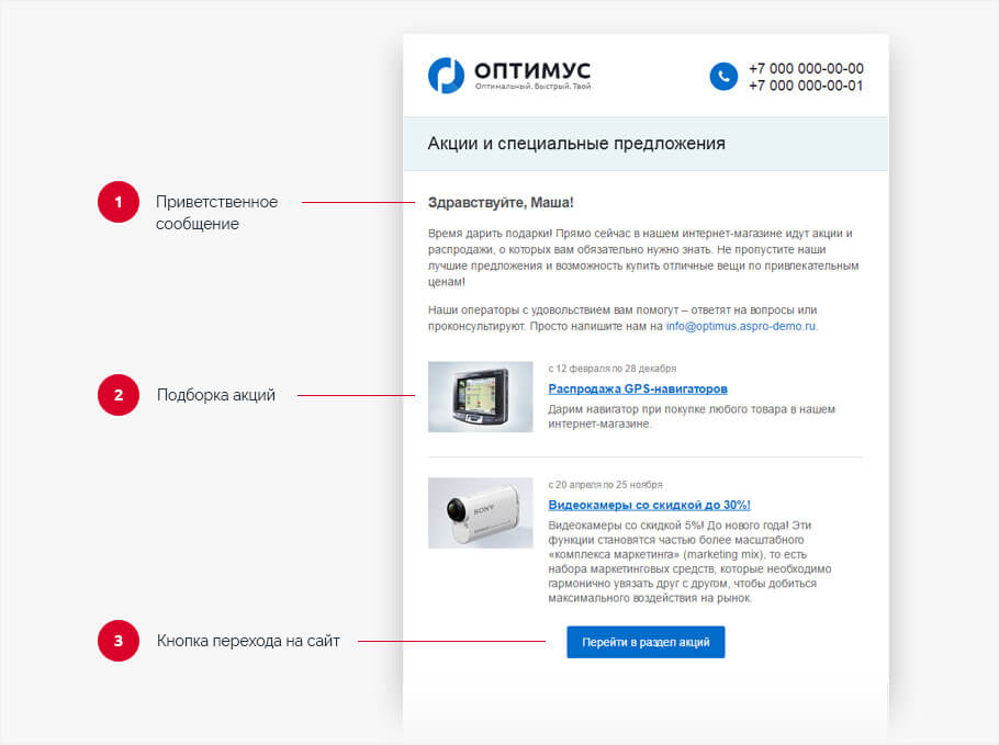 Пример: после регистрации пользователь получает серию из приветственного письма, списка акций и специальных предложений, подборки персональных рекомендаций на основе просмотренных товаров и купона со скидкой на первый заказ.
